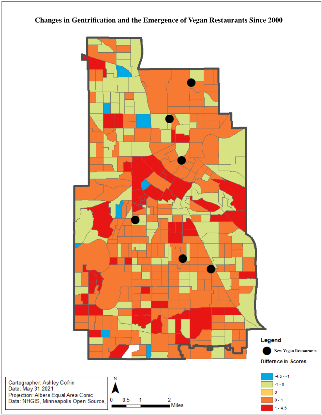 Although gentrification has been studied extensively from multiple disciplinary perspectives (Goetz, 2019), it is a phenomena that does not have a single definition or outcome. It is commonly connoted as a negative process; however, even low-income households that worry about gentrification are frequently in favor of neighborhood improvement, but show active concern of displacement (Goetz, 2019). Because of the lack of a universal definition, researchers use a number of different measures of gentrification. I use three factors to gauge gentrification: income, percent of people with some college education, and percent of owner versus renter occupied spaces per block area in Minneapolis. I calculated principal component analysis scores of these three factors and added them to create one index score. On the map, this index score is referred to as “score of advantages” due to recent discussions considering that gentrification itself is hard to score and has many changing factors. Calculating gentrification in this way will show the spatial pattern of shifting advantages in Minneapolis; making it possible to show its potential correlation to vegan restaurants in the area.
