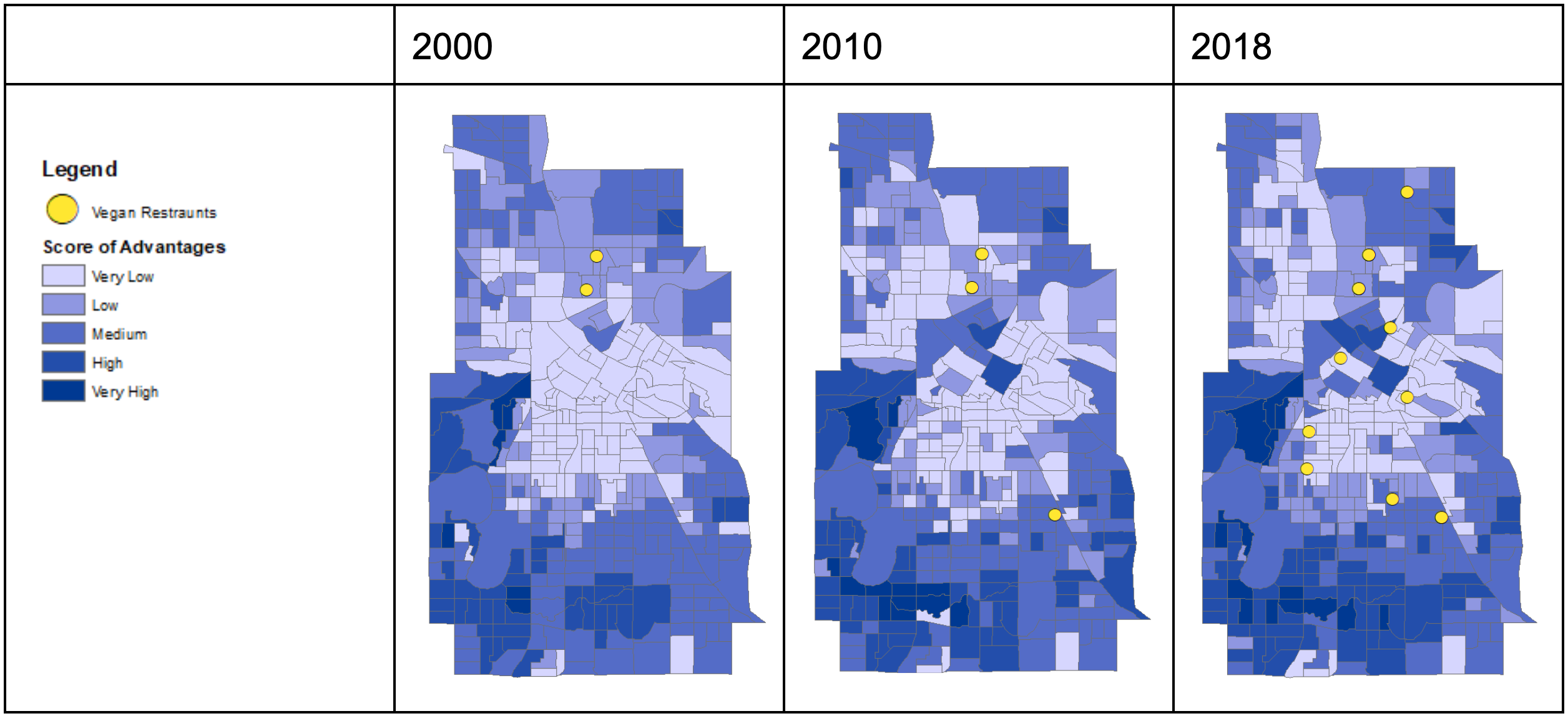 The results show that vegan restaurants that appeared between 2000 and 2018 are in areas that have more measured 'advantages' now than they did in 2000; while every time they are on the edge of an area that had slightly declined in their calculated advantages (Figure 1). None appeared in areas of ‘very’ increased advantages over the last 18 years. There is also a pattern of vegan restaurants surrounding the least advantaged area with nearly none in the middle; this least advantaged center slowly closes in over time (Figure 2). These patterns are indicative of vegan restaurants and gentrified areas moving spatially in similar ways although further research is required to understand the interaction between the two social phenomena. Veganism has many benefits on a personal and environmental scale; so while the trending diet may be spatially correlated to gentrification, it is not meant to be discouraged with these results. Future investigation should do community surveying to have a deeper understanding where a high density of people who eat vegan diets are, along with further research on defining gentrification.
