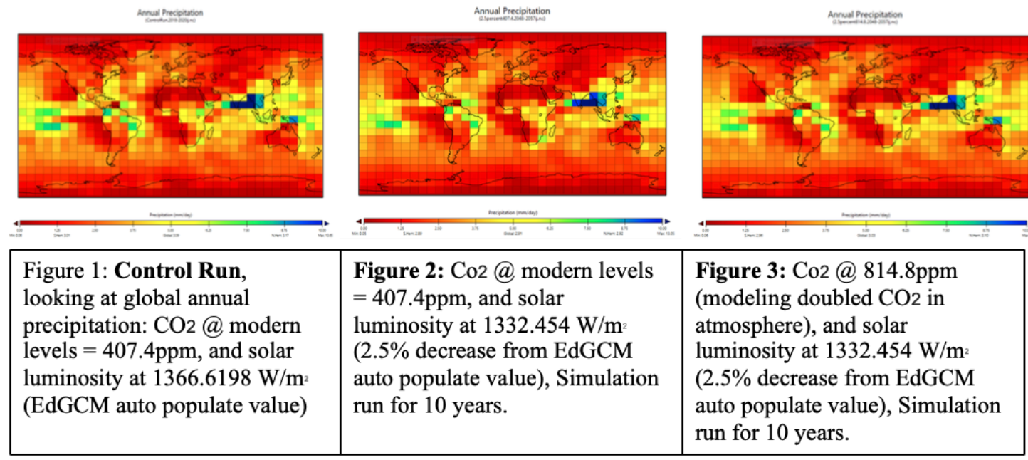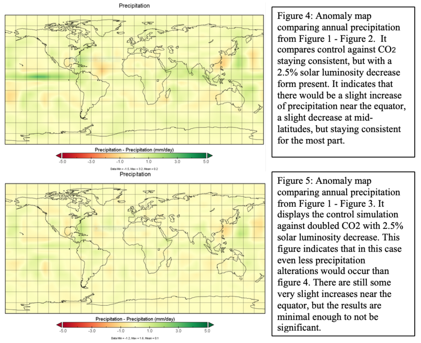 Our hypothesis that a 2.5% decrease in solar luminosity (which represents injections of aerosols into the atmosphere) will produce similar surface temperatures to the control (present amounts of CO2, and present amounts of solar luminosity). Is accurate in that there was partial global cooling and neutralizing under both conditions. As discussed, this is not true from region to region, and may be inaccurate given our current resources. The second part, hypothesizing that: precipitation will also be affected to a point of significance but at a smaller scale, was inaccurate. The precipitation levels were not affected to a point of significance; although as discussed earlier, this may be untrue in actual implementation or more in-depth simulations.