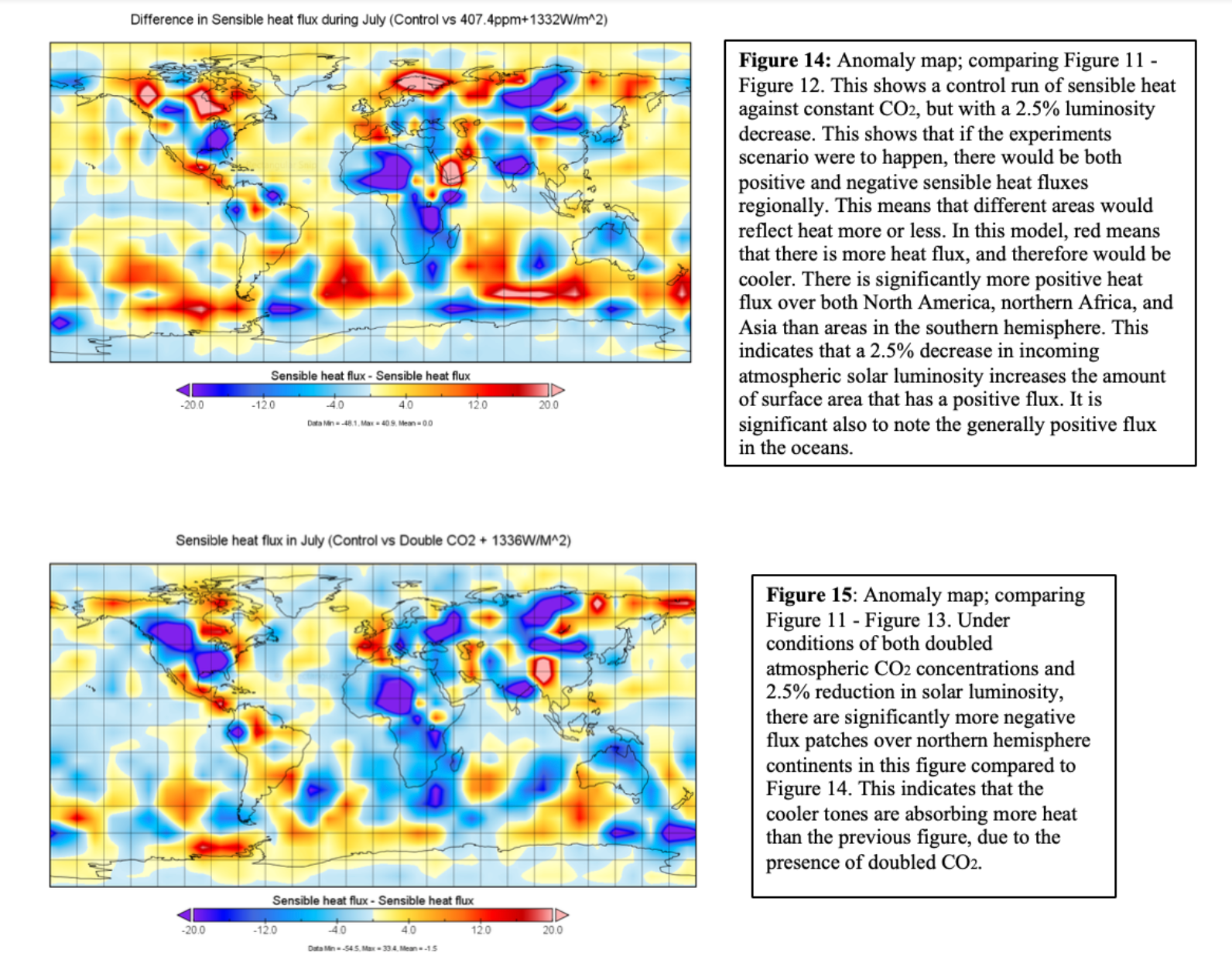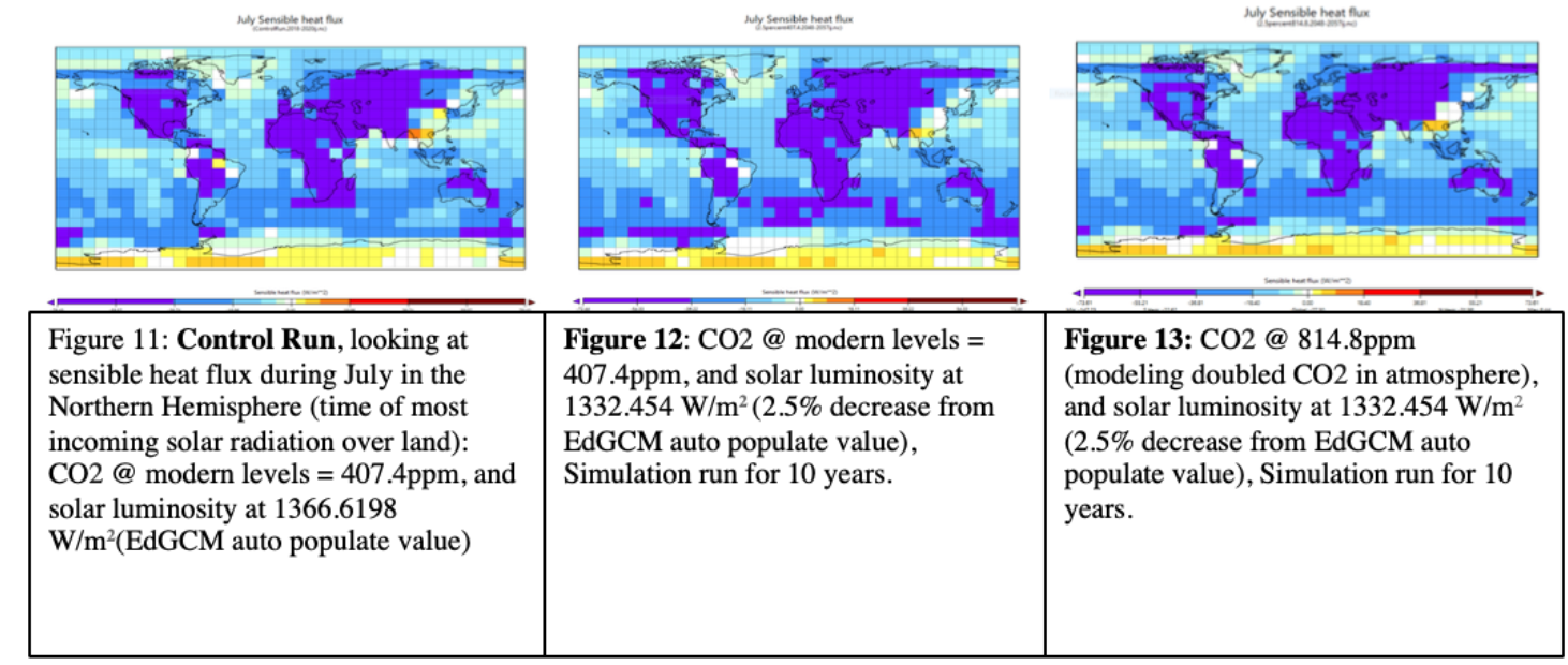 Our findings show that as solar luminosity increases, surface air temperature and negative sensible heat decreased as expected. Precipitation shows slight variation, but very minimally as depicted by Figure 4 and 5. Figure 13 displays that if CO2 levels were to double, in conjunction with decreasing solar luminosity by 2.5%, that the sensible heat levels would be considerably lower than if solar luminosity where to stay consistent; it would be nearly the same as if there were no CO2 increases, or changes in solar luminosity. Figure 9 shows how a decrease in solar luminosity while holding carbon dioxide constant at modern levels, decreases annual surface temperature globally. While Figure 10, demonstrates how changing incoming solar luminosity under conditions of higher CO2 concentrations has less of an effect on surface temperature, most notably around the poles.