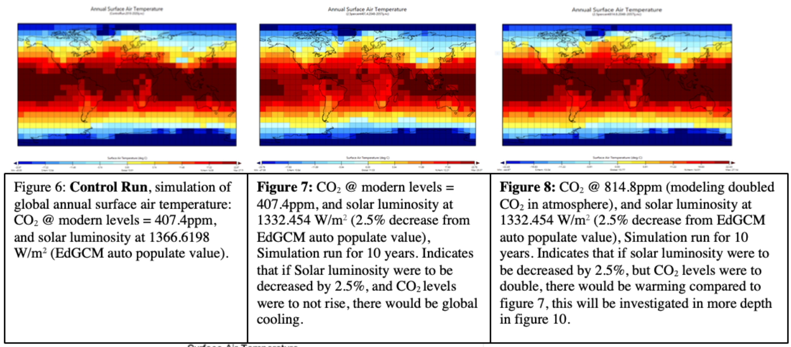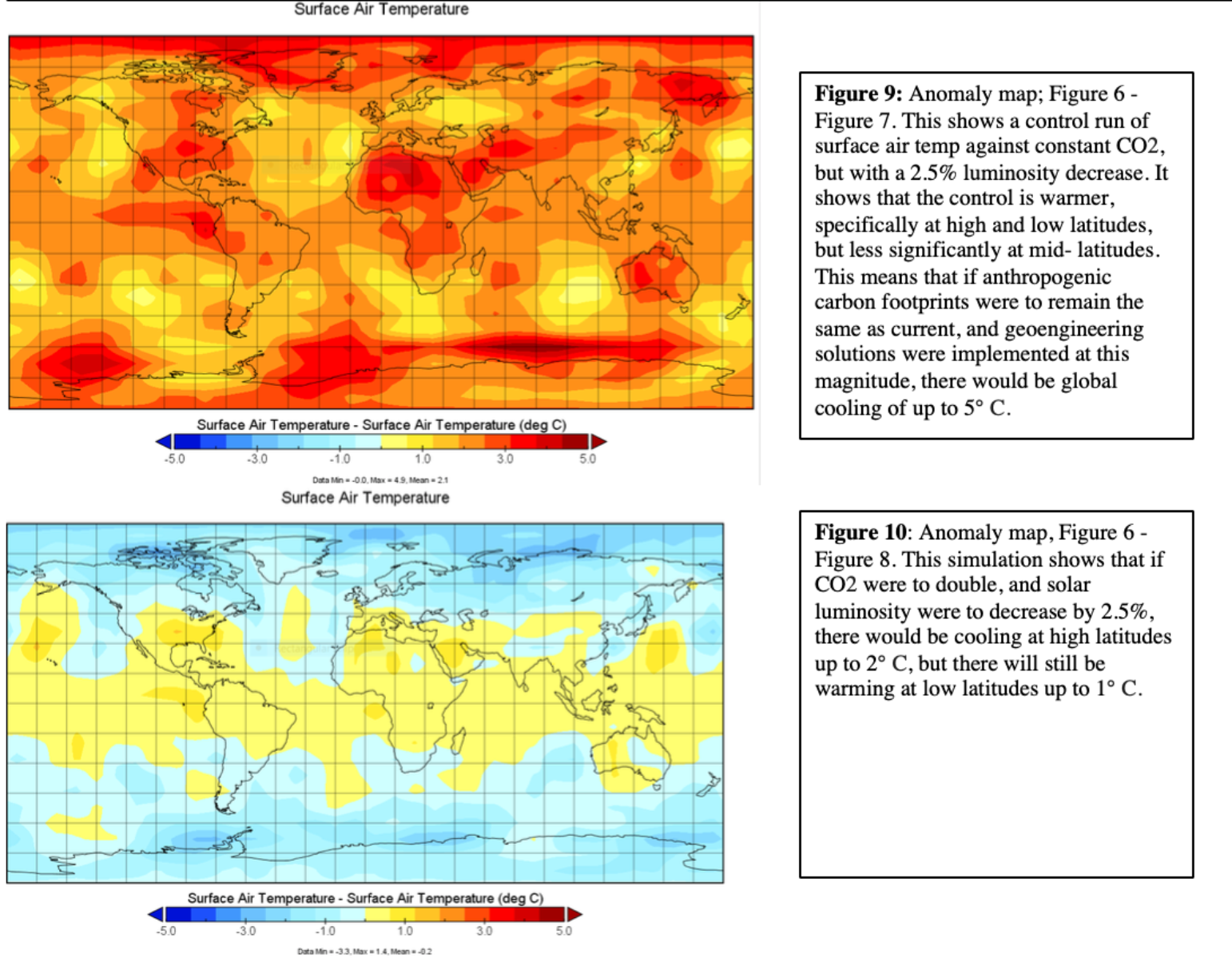 Our findings are significant because they show that decreased solar luminosity is able to mitigate some of earth’s warming that is caused by carbon dioxide. If sulfuric acid were put into the atmosphere to reap albedo effects at a large enough quantity, it would be effective in regards to reducing solar luminosity. Our simulations show that this decrease in solar luminosity in conjunction with doubled CO2 keeps surface air cooler than without the decreased solar luminosity, due partially to higher amounts of negative heat flux, translating to a cooler climate.