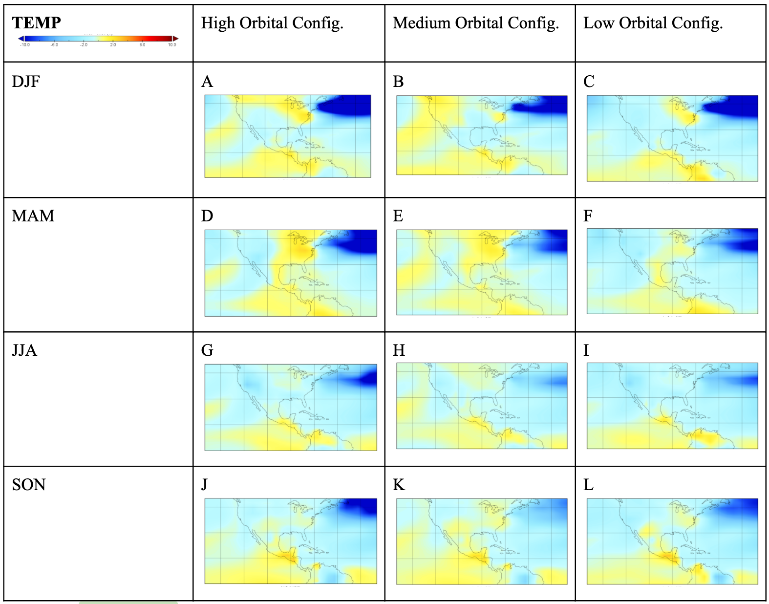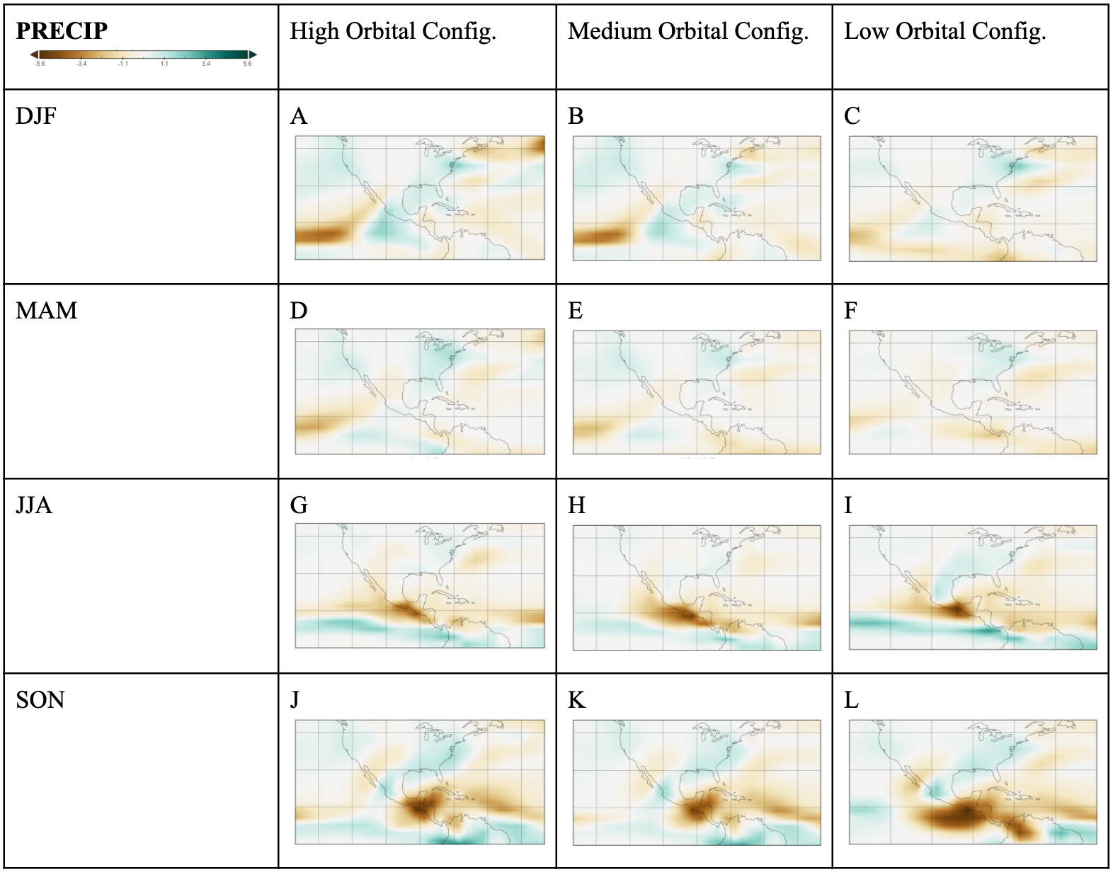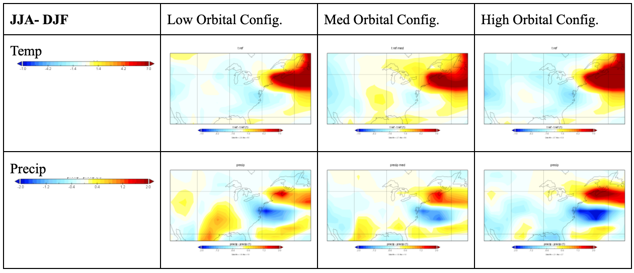 The change in precipitation across orbital configurations simulates year round wetting in ENA; the pattern of drying and wetting is specific to each season, while orbital configurations modify the magnitude of the patterns. In the ENA, orbitally induced variation is greatest in winter with a 2.5 mm/day increase in the low configuration; the high and low orbital configuration experiments are similar, while medium shows a smallest wetting. A common, isolated, but large wetting is present in the NEUS across all orbital configurations, especially in the low and high experiments. Spring also has consistent wetting but the magnitude is lower while the spatial extends as far west as Michigan and as far south as the east coast. All orbital configurations simulate a common lack of change in precipitation during the summer, perhaps a result of common atmospheric mechanisms.